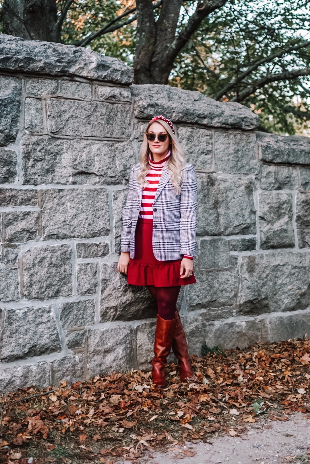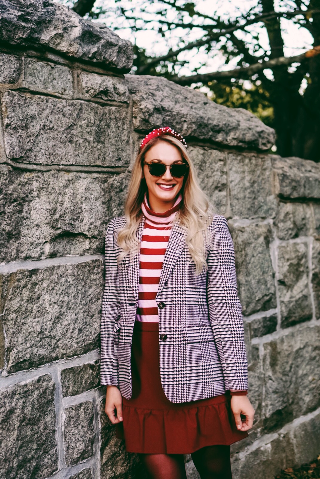 Outfit Details: Top / Blazer / Skirt (similar) / Headband / Sunglasses / Boots